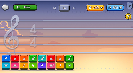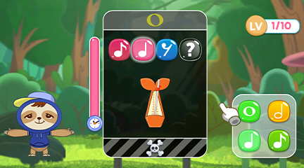 귀여운 캐릭터들과 함께하는 애니메이션과 그리기 게임, 박자 큐브 게임을 통해 각 음표와 쉼표의 길이를 자연스럽게 체득하며, 도돌이표와 페르마타 까지 완벽하게 이해하여 첫 리듬 작곡에 도전합니다.